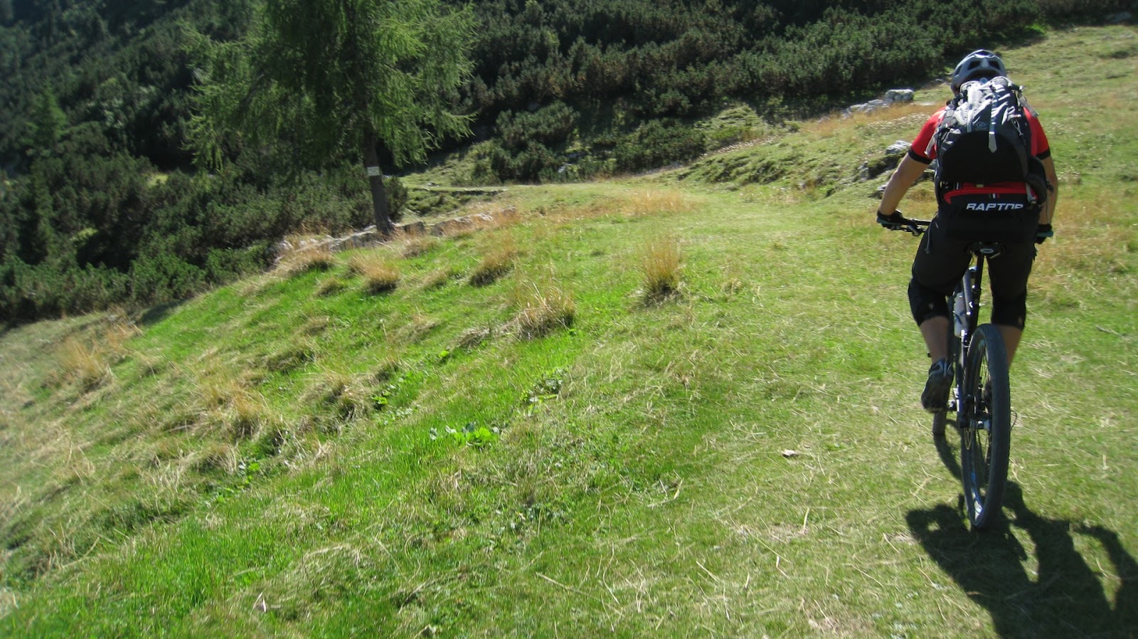 Contemplato il panorama a 360° senza una sola nuvola o foschia dispettosa, scendiamo al cippo Austriaco (2086) a visitare la trincea sottostante. Ne approfittiamo per divorare i panini speck & asiago e a scattarci qualche foto.Ripartiamo ripercorrendo qual centinaio di metri verso il cippo italiano. Ci sono dei tratti da fare bici in spalla. Come faccio per scendere di sella, scivolo, poi nel tentativo estremo di salvarmi dalla caduta metto il piede malamente sopra ad un sasso, trakkete! un male bestiale alla caviglia e finisco per terra: piede gonfio e un male boia ad appoggiarlo a terra... azz.. che fare? Chiamare soccorso? No, dopo un paio di minuti per abituarmi al dolore mi rialzo e provo a risalire in sella... Impreco ma ci riesco e, a non credere, non mi fa poi tanto male finchè resto in sella. Paolo vorrebbe scendere per la via piu' breve verso Asiago ma insisto per provare a continuare la traccia. Dovevamo scendere per l'839 direzione Pozza dell'Ortigara- Bivacco Campi Lussi , lo imbocchiamo ma poi nella foga d scendere probabilmente prendiamo per una variante verso Monte Campigoletti. Ci accorgiamo dopo una cinquantina di metri ma di scendere a piedi per poi risalire non ne penso proprio.. e comunque questa variante e' proprio bella: singletrack su rocce, dapprima, poi su mulattiera ci ricongiungiamo alla strada dell'andata fino al Bivio Italia. Da qui però prendiamo per l'830 verso la Selletta Mecenseffy , poi Campo Gallina e bivio dei Monumenti. Mi prendo anche una sassata sollevata dalla ruota anteriore sullo stinco : mi compare subito un bozzo enorme... oggi non è giornata. Continuiamo.Ora tocca a salire... provo a spingere sui pedali e resisto.. il piede mi fa male solo a piegarlo, se spingo senza forzare non mi fa male, seppure gonfio come una zampogna. Saliamo su un sentiero non numerato verso il Monte Meatta. Il sentiero sale restringendosi in costa al monte con veduta eccezzionale sulla sottostante Valle di Portule. Verso la cima del monte diventa un single track erboso che poi si addentra nel bosco e scende a tornanti su fondo compatto e scorrevole: molto bello, peccato solo per alcuni tronchi messi di traverso che obbligano a fermarsi.
